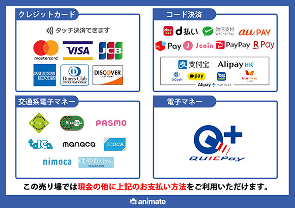 ・CD/DVD/Blu-ray物販では現金/クレジットカード/QR決済がご利用いただけます。