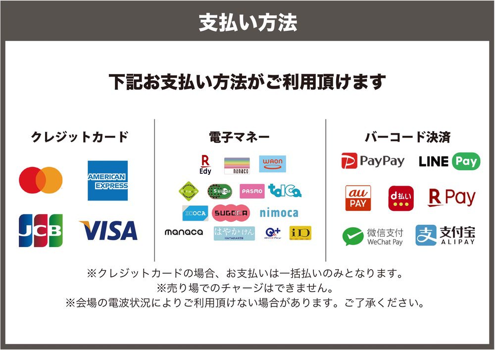 ・グッズ物販では、下記クレジットカード・電子マネー・バーコード決済等をご利用いただけます。